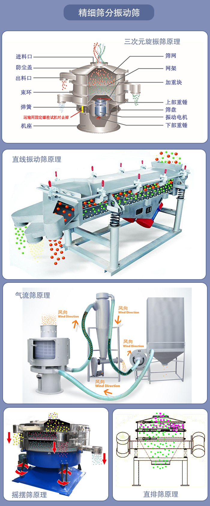 直排篩的原理是通過(guò)振動(dòng)源的作用使物料在篩面做三維運(yùn)動(dòng),這種運(yùn)動(dòng)方式可以使結(jié)塊物料散開,快速的通過(guò)篩網(wǎng)。精細(xì)物料直接由下部排出,雜物粗料則通過(guò)排渣出料口排出。