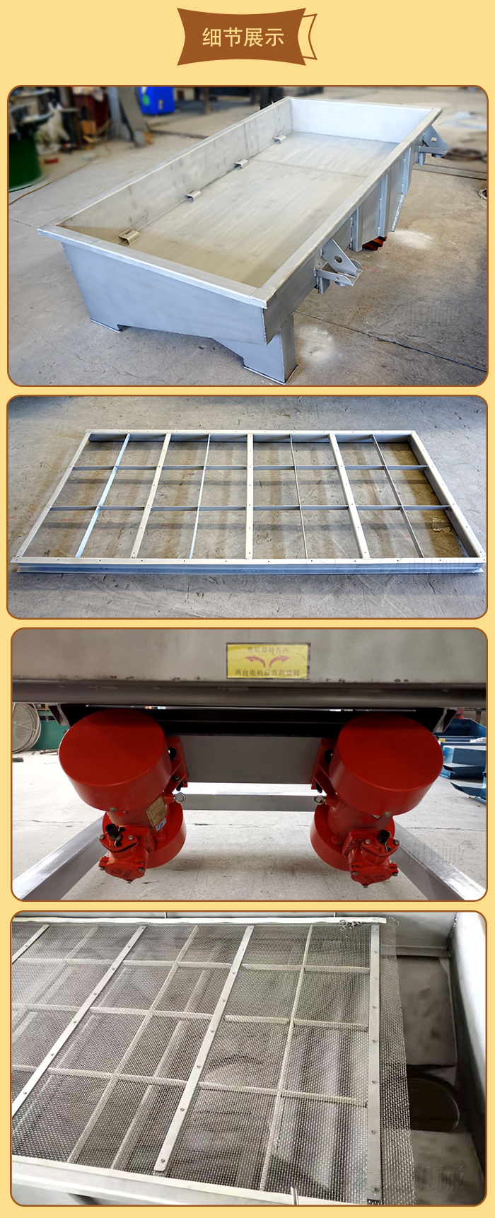 5、電機(jī)臺(tái)座:安裝振動(dòng)電機(jī),使用前連接螺釘必須擰緊,特別是新篩機(jī)試用前三天、必須反復(fù)緊固,以免松動(dòng)造成事故。